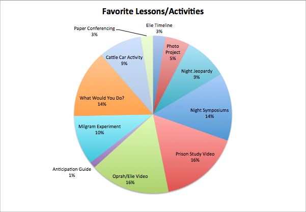 What stood out to me first is that there were some strong reactions to the symposiums, both positive and negative. I think this relates to the fact that some students enjoy having the opportunity to discuss texts with peers, but for some, public speaking is such a daunting task that they couldn’t get comfortable in the symposium format. Either way, the symposiums led to some great discussion and critical thinking, so I would definitely do them again in the future. Other standout favorites include the Stanford Prison Study lesson, the Oprah and Elie interview, and the What Would You Do? roles lesson. All of these activities were supplemental to the text, which gave students more ways to access the material and gain a deeper understanding. The most commonly listed as least favorites included the photo project and the reading guides. In retrospect, the way the photo project was presented to the students might have made it overwhelming; there are many parts to it, so it might have been better to introduce each part individually, instead of giving it all to them at the same time. As far as the reading guides, in the future I would like to come up with more novel, interesting ways to assess student learning on the texts. Reading guides often seem to be very dry, and many students noted that the reading guides were more of a chore than they were actually contributing to their reading comprehension. Overall, the results were similar to what I expected, based on student engagement during these activities.