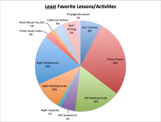 My last day of student teaching, I asked the students to fill out a short survey asking them about their favorite and least favorite activities or lessons from the marking period. During our last classes, I distributed these surveys and asked students to take 5-10 minutes to fill them out. In part, I wanted to see the survey results because I believe that students’ favorite activities are also the ones they’ll be most engaged in and make them more receptive to learning the skills I’m helping them develop. That being said, one important question to consider is how much should student enjoyment factor into planning lessons and activities? I do think, as mentioned above, that student interest is a vital part of increasing student learning, but are there some skills students need to learn that they just don’t like practicing no matter what form the lesson takes (e.g. public speaking)? It’s a big question that doesn’t necessarily have a “correct” answer, but it is something to think about both while viewing these survey results and more generally when planning. The other reason I wanted students to take this survey is that we developed a new curriculum for the marking period I taught, focused on the Holocaust and Elie Wiesel’s Night. I felt it particularly important to get feedback from students since this was the first year for many of these lessons. Note: At the bottom of this post is an appendix with descriptions of each activity and lesson.
