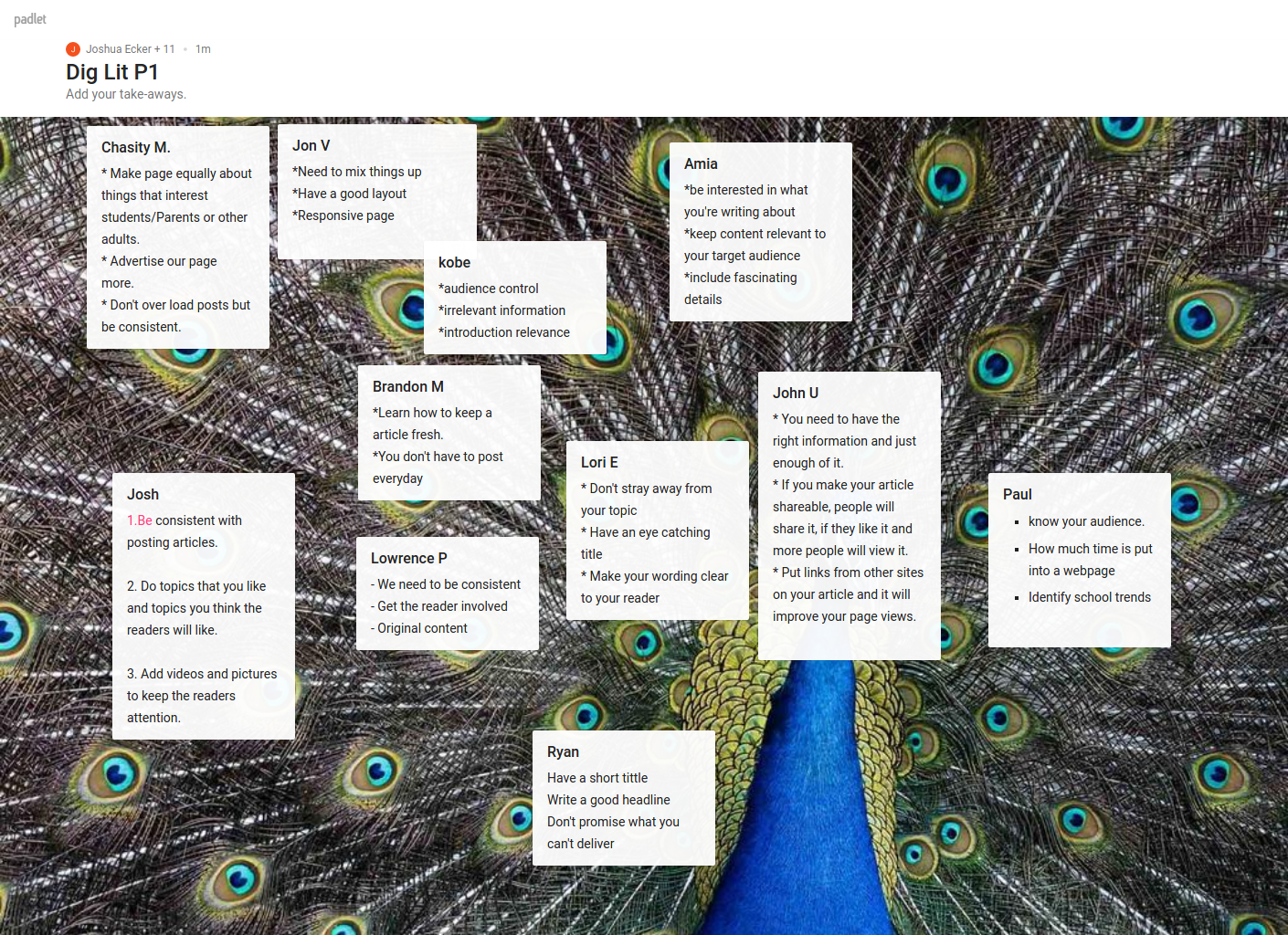 I’ve seen a lot of teachers use Padlet to collect student exit tickets (allowing other students to, for example, see what their classmates’ takeaways were for that lesson) and I really like that idea. Because of Padlet’s simplicity and ease of use, there are a million ways it could be utilized. In my 10th grade elective class, we focus mainly on creating content for the online school newspaper. As we near the end of the school year, we’re shifting our focus to the marketing/advertising aspect of running a newspaper. For this Padlet, students had to write down their key takeaways from the marketing research they’d been doing the past few days on how to increase our page views (click the picture to enlarge):